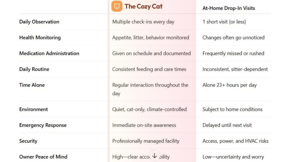 Cats are experts at hiding illness and stress. At Cozy Cat, your cat is observed multiple times per day—not just fed and left alone.
